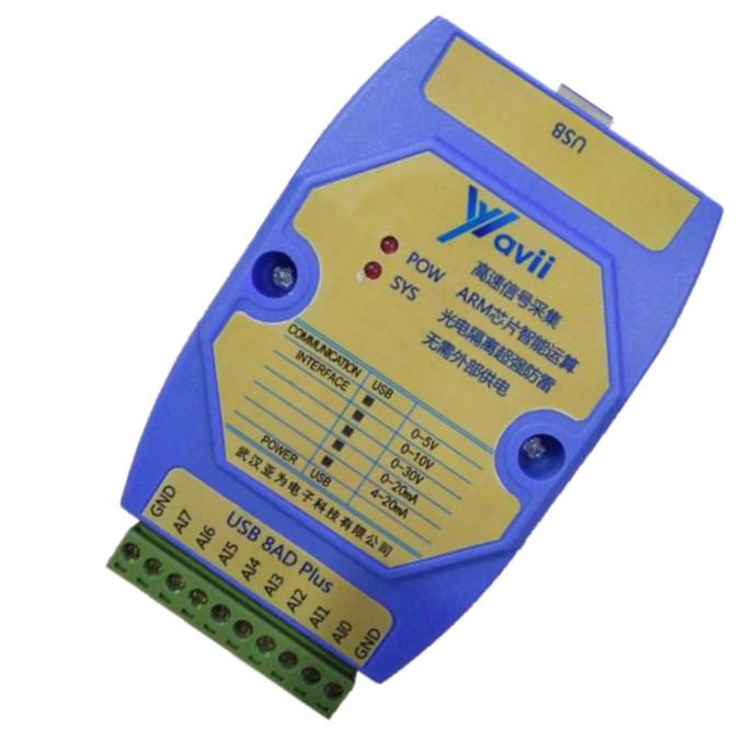 此次研究采用了武汉亚为电子科技有限公司的USB 8AD Plus采集卡,该采集卡由与之连接的电脑供电,不再需要额外的外部电源,因此很方便,该采集卡共有八个通道,每个通道都可以采集0-10V的电压信号,可与许多种类的仪器搭配使用,该数据采集卡的默认采样率为 1kHz,还可以可设为 200Hz 500Hz 1KHz 2KHz 5KHz 10KHz。