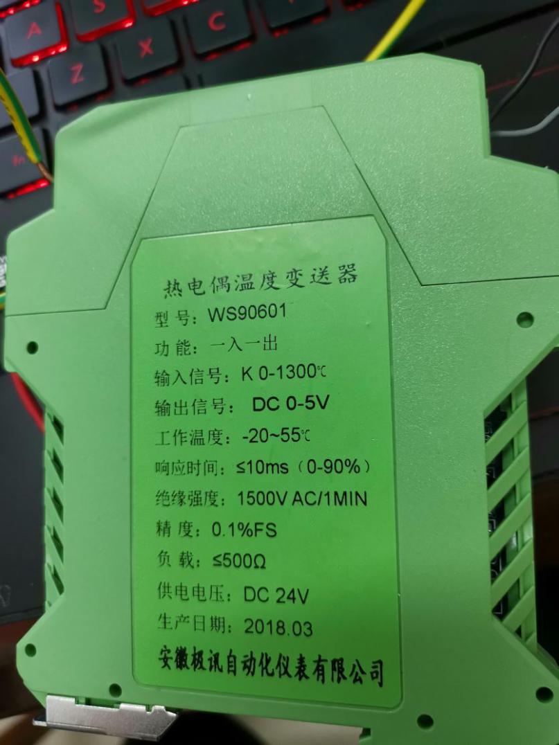 温度变送器有不同的型号,根据输入信号的温度范围可以分为K型、J型、S型、T型、B型和R型,而且根据通道数,可以分为一进一出式、一进两出式和两进两出式,本次研究的测试系统采用的是一进一出式的型号为WS90601的K型热电偶温度变送器,如图2.3所示,温度变送器的作用就是将本次实验温度传感器所检测到的信号变成电压,这种型号的热电偶温度变送器的输出信号的电压范围为0-5V。如前所述,数据采集卡的输入信号的范围恰好是0-10V,因此温度变送器的这个范围的电压信号可以很好地被数据采集卡识别和采集,只有将温度信号变成了统一标准的信号才可以输出到显示仪器,从而把实现对焊接热循环曲线的显示、存储和回放[8]。在温度变送器的背面有接线示意图,即便是新手,也可以很快的指导如何将这些硬件连接起来。本次采用的温度变送器有如下特点: