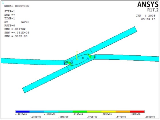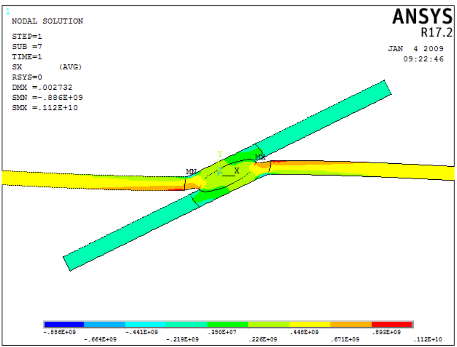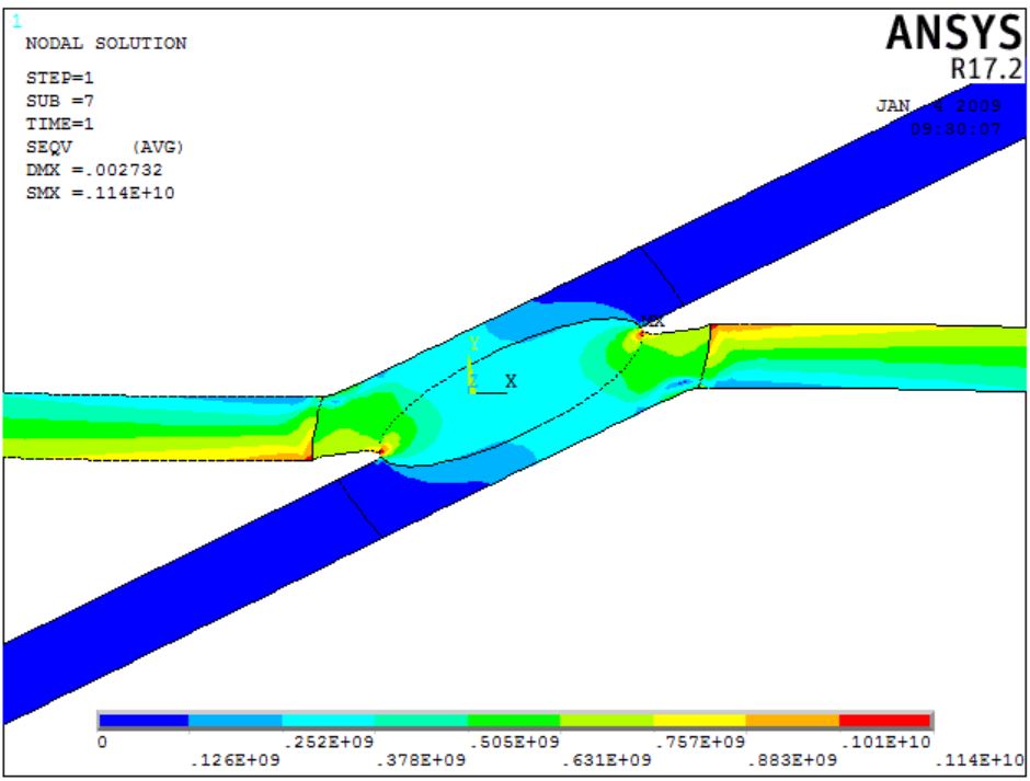本论文通过探究熔核和塑性环尺寸,搭接长度改变时最大应力的变化规律,可以得到这些结构参量对超高强钢点焊接头强度的影响。利用ANSYS的线性化路径操作,可以获得等效应力的分布曲线,从而直观的感受应力在不同区域的分布情况。除此之外,还将材料属性相同的模型分别进行了静力学和瞬态分析,对比了不同分析方法对结果造成的差异。