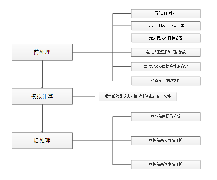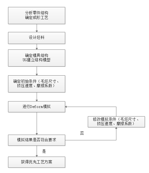 本课题通过对万向节三销轴零件进行结构分析,确定其成形方案,并根据结构运用UG软件进行凸模和凹模的结构设计,然后运用成形模拟仿真软件Deform建立挤压模型进行仿真,通过改变高径比,挤压速度,摩擦系数等模拟参数产生不同的模拟结果,经过分析确定各模拟参数对万向节三销轴闭塞挤压的影响,确定最佳的挤压方案。最后运用UG软件三维建模和装配功能绘制模具重要零部件,并根据零件间的约束进行装配,生成装配图及零件图,主要过程如下图1.2所示。