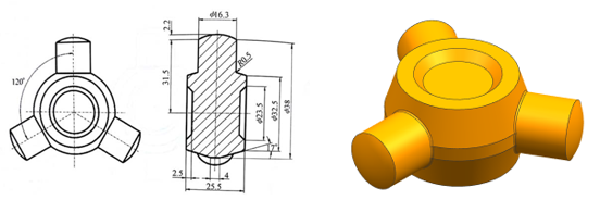 万向节三销轴的的设计图和计算机三维模型如图2.1所示。万向节三销轴形状具有对称性,上下为两个带有凹槽的圆台,周围伸出三个互成120°的轴颈。运用UG体侧量工具测得体积为32820.4863mm3,高度为25.5mm,最大外廓直径为67.4mm,轴颈直径16.3mm,凸缘高度2.2mm,圆角半径0.5mm,其余具体尺寸如图2.1所示。