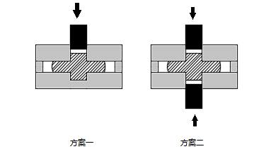 方案二:上下两个凸模双向等速挤压成形。