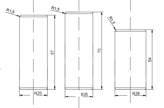 坯料的尺寸设计主要是基于毛坯体积等于挤压件体积的不变定律进行计算。万向节三销轴的体积V运用UG的体测量工具测得为32820.4863mm3,由于零件的带凹槽部分最小直径D1为25mm,最大直径D2为32.5mm,确定两个坯料直径D3为25mm,D4为28mm,根据体积计算公式可计算出高度h3约为67mm,h4约为53mm。考虑到挤压过程中材料可能需要余量,因此最终确定三组规格的坯料,依次为25mm67mm,25mm70mm,28mm54mm,坯料圆角为1.5mm。坯料如图2.3所示。