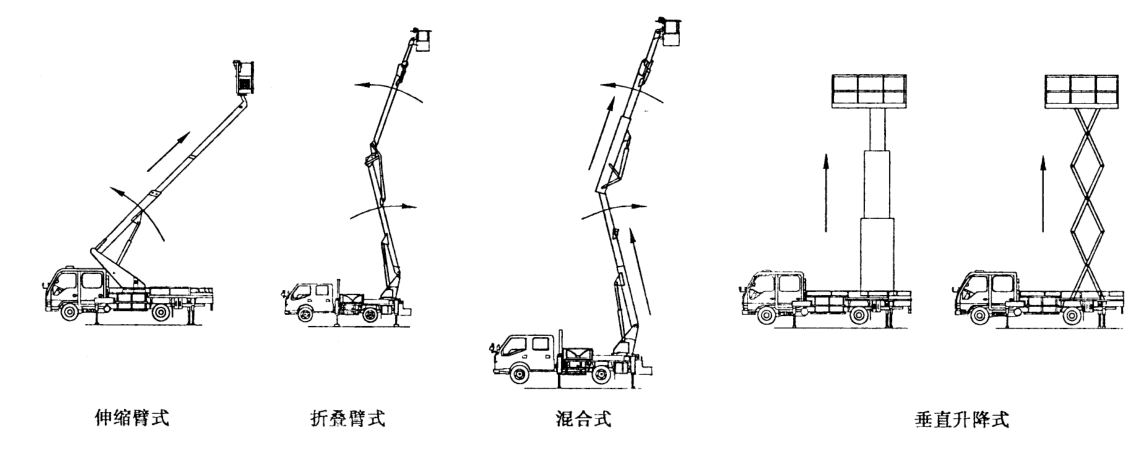 按照GT/B 9465-2018《高空作业车》中的规定,高空作业车可以分为:伸缩臂式的高空作业车、折叠臂式的高空作业车、混合式的高空作业车和垂直升降式的高空作业车[2]。