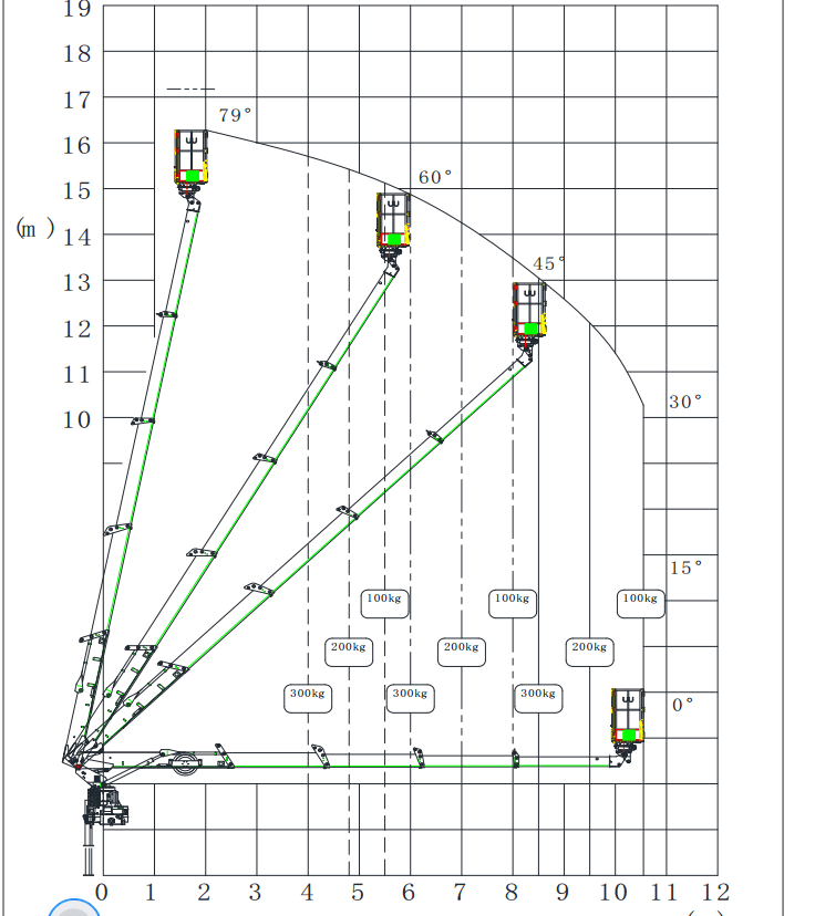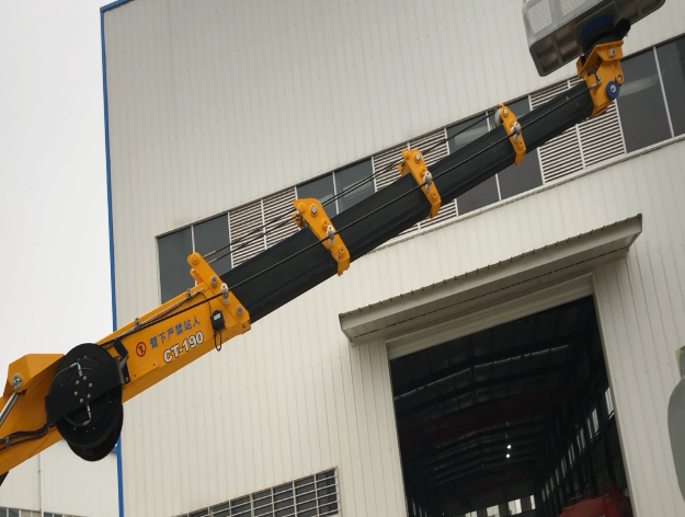 伸缩臂式的高空作业车,在工作时伸缩臂伸出以满足工况的要求,完成工作后将伸缩臂收回到最小尺寸保存。这种形式的作业车操作简单,工作时较为稳定,效率相对较高,这种形式往往应用在大高度的作业车。