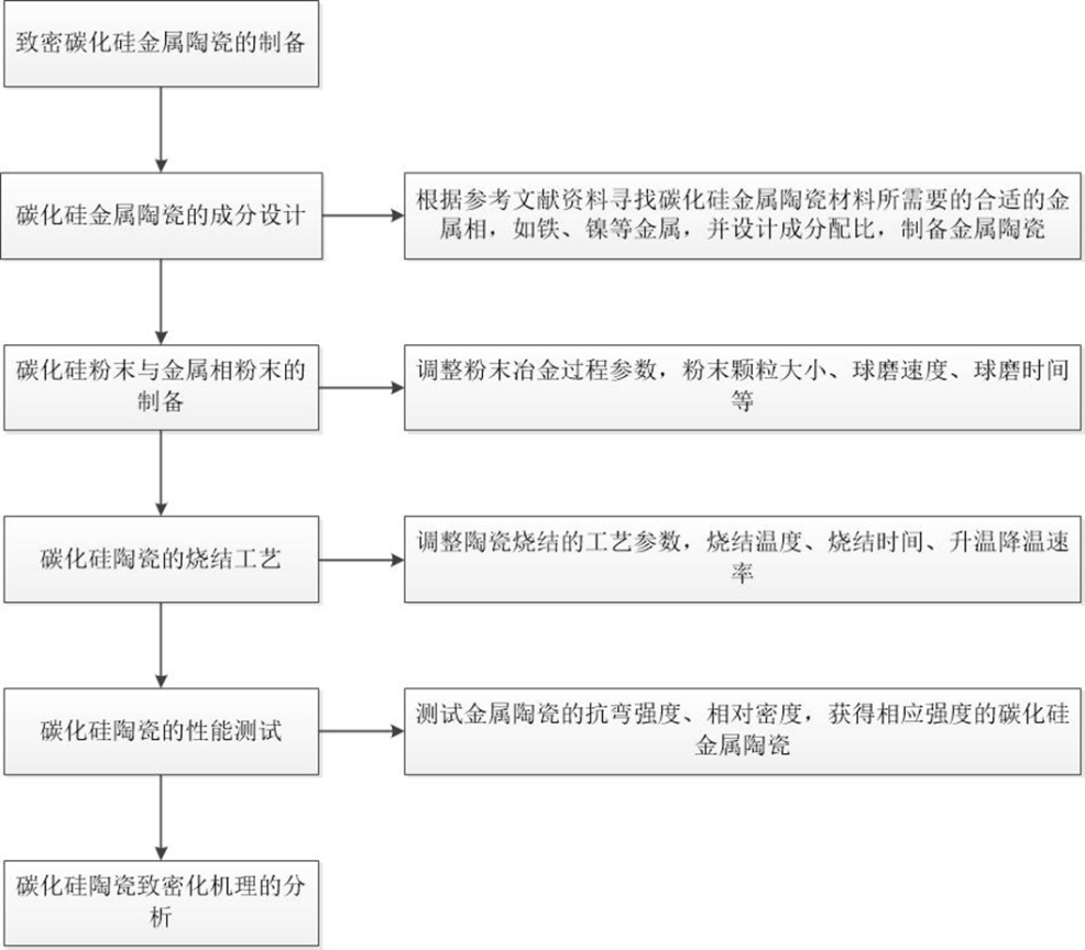 相关研究表明,若向传统的SiC基金属陶瓷中添加低熔点金属,能够有效地降低其制备温度,有利于进行陶瓷粉末的粘接作用,从而实现低温烧结。本文将通过调控SiC基金属陶瓷的复合成分,一方面可以调整该材料的导电导热性能,改变其类似半导体的导电特性,增强其导电性能,并进一步改善金属陶瓷的平均密度,努力向致密化靠近,使低温烧结成为现实。另一方面可以满足电火花加工的硬性条件,从而使得SiC基金属陶瓷的后期加工趋于精确化和复杂化,这对于实现传统制造业的转型和国民经济的稳定发展有着十分重要的意义。技术路线如下1.1图所示。