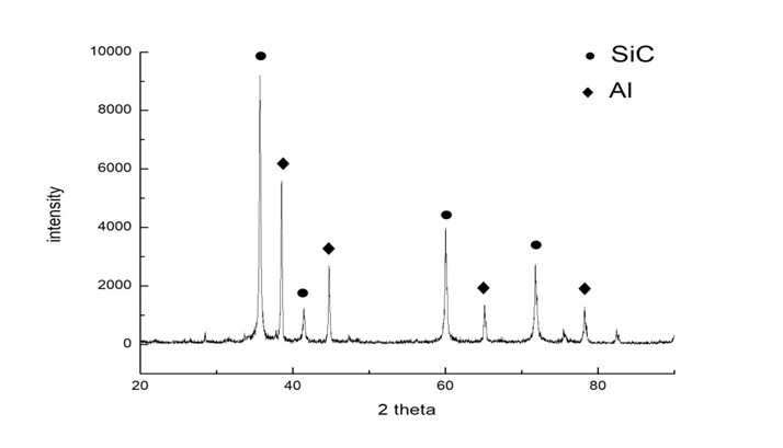 The burnout rate, flexural strength and average density of the SiC-based cermets with four compositions at four sintering temperatures of 660°C, 680 °C, 700 °C and 720 °C were measured, and the optimum flexural strength was selected. The sample was observed by M-5XC inverted metallographic microscope to observe the microstructure of the cermet, and the composition analysis was carried out by X-ray diffraction analysis (XRD) to further study the microstructure and properties of the SiC-based cermet. The SiC-based cermet with the addition of metal powder Al was selected and tested for its comprehensive mechanical properties (bending strength, average density) compared to other components.