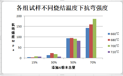 分别检测四种成分的SiC基金属陶瓷在四种烧结温度660℃、680℃、700℃和720℃下所得试样的烧损率、抗弯强度和平均密度,并选择其中抗弯强度最优的试样,通过M-5XC型倒置金相显微镜,观察金属陶瓷的显微组织,并结合X射线衍射分析(XRD)进行成分分析,进一步进行SiC基金属陶瓷的组织性能的研究,实验证明,选用添加金属粉末Al的SiC基金属陶瓷,通过测试其综合机械性能(抗弯强度、平均密度)相对其他成分较优。