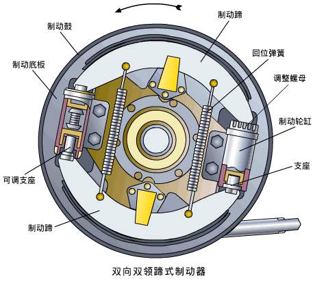 鼓式动器由一般制板制动动蹄底制仍然分泵动片制仍然以鼓动制仍然连弹及簧组等成杆[[1]],首先通过它将置装压液液递传压动力上分泵到制后,再过然连弹通杆簧蹄片动制将使其向外推出生与产制相动鼓对摩擦前阻而止[[2]]。它首先通过液压装置将液压力传递到制动分泵上,然后再通过连杆弹簧将制动蹄片向外推出使其与制动鼓产生相对摩擦而阻止汽车前进[[3]]。从汽车诞生至今己有百年的历史,国内外许多专家学者对制动器都做出了大量的、开拓性的研究,涉及到摩擦学、动力学、振动理论和接触力学等多个研究领域[[4]]。国内也有很多学者对汽车制动器进行了相关研究[[5]]。
