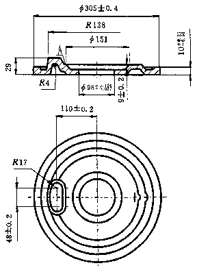本工件首先经圆剪获得Φ341的原材料,再经冲工艺孔,制成圆片,然后进行拉深,拉深成环形件,凸台部分内圆角r为8mm。