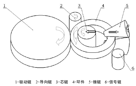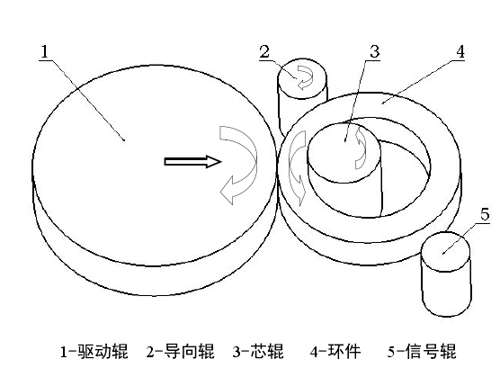 轧辊有多种安置方式,环件径向轧制可分为立式轧制和卧式轧制【14】。此处用卧式轧制为例来解释环件径向轧制的工作原理,其轧制原理结构如图 1.2 所示。轧制时,将环件毛坯用专业工具夹子迅速套在芯辊上,操作驱动辊使其在液压或气动装置作用下进行径向运动,当接触环件毛坯时停止运动,并开始进行环件轧制过程【14】。一般情况下驱动辊是主动辊作旋转运动,同时在液压装置作用下沿径向作进给运动,芯辊以及导向辊为被动辊,受摩擦力的原因跟随一起转动。环件毛坯在驱动辊和芯辊孔型之间发生连续塑性,直至达到预定的设计尺寸,此时,环件接触信号辊,设备停止并结束了整个环件轧制阶段。