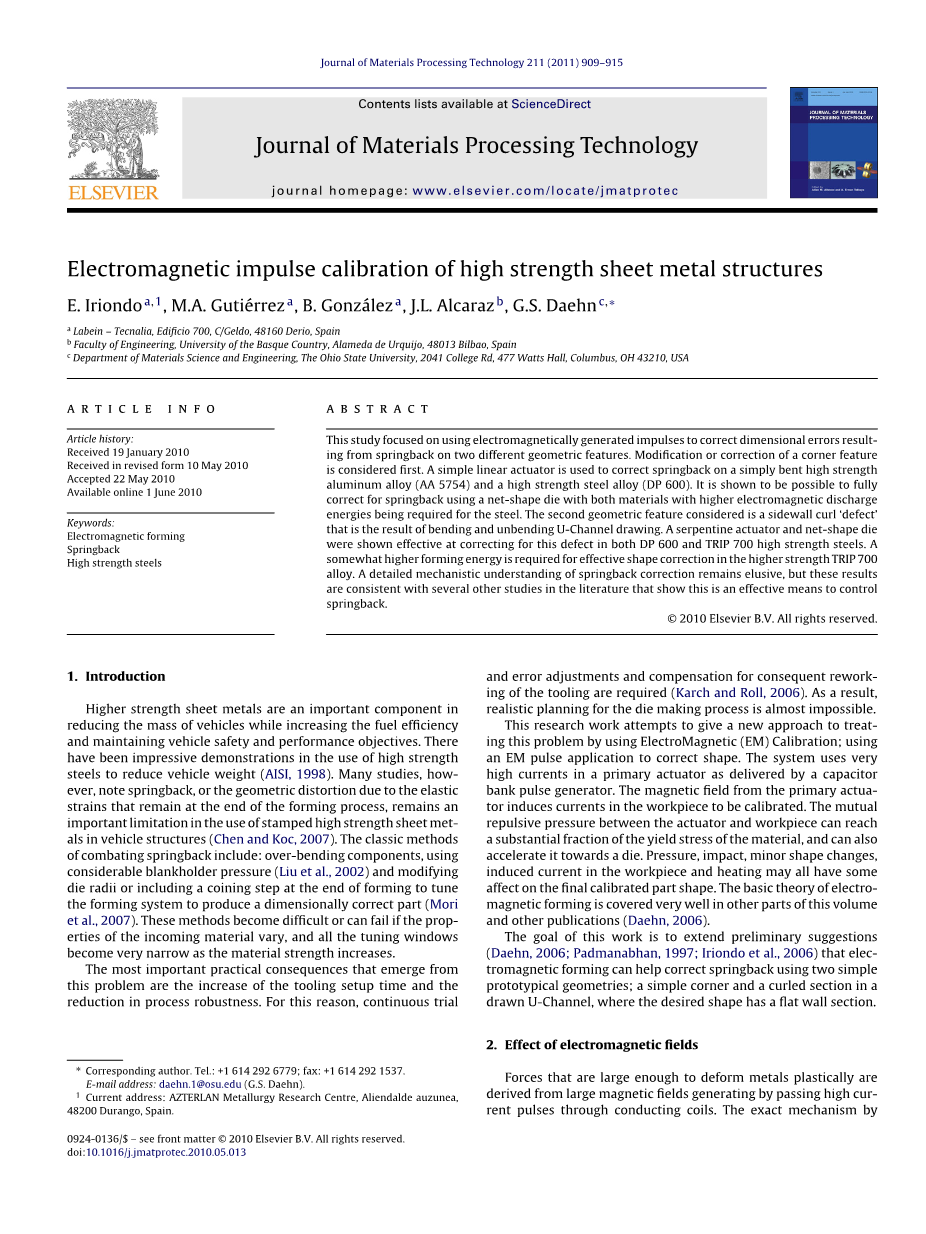 关键词:电磁成形、回弹、高强度钢