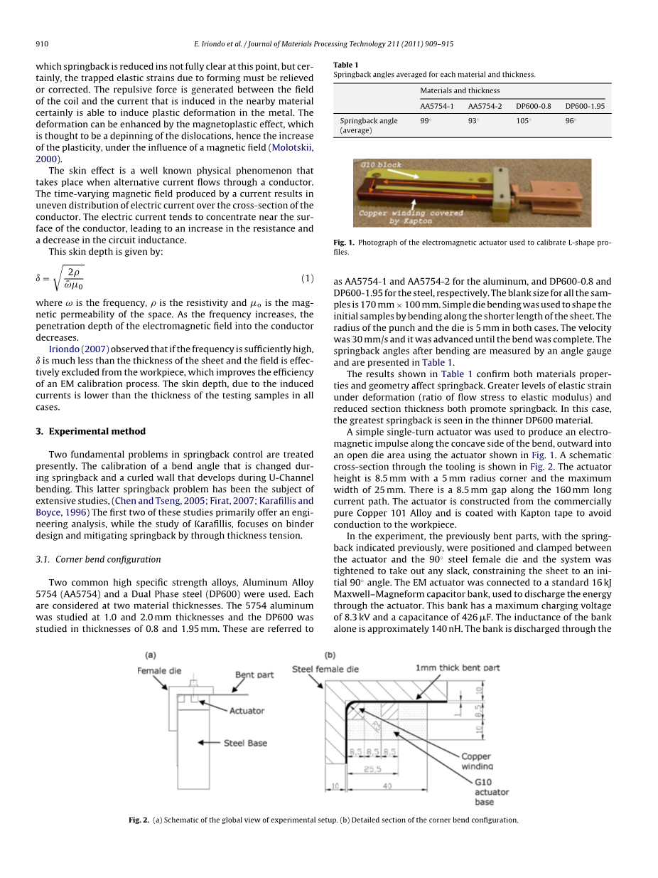 在实验中,先前弯曲的部分和他所造成的回弹,被定位并且夹在执行器和90度之间。钢制的下模具和上述系统被拧紧避免有任何的松弛,将薄板限制为90度角。EM执行器连接到一个校准的16kj的max磁式电容器组,用于给执行器提供电量,其最大的充电电压为8.3kv,电容值为426F,电感系数约为140nh。这放电的线圈非常的接近工件,如图二所示。执行器与工件之间的间隙小于300m,绝缘问题有卡普顿来保障。各种不同的电荷量(以及随后的电压)都用在各种材料和各种厚度的工件上。时间是用线圈测量的。在电磁脉冲完成后,将模具移开,并通过角度测量来测量坯料的弯曲角度。