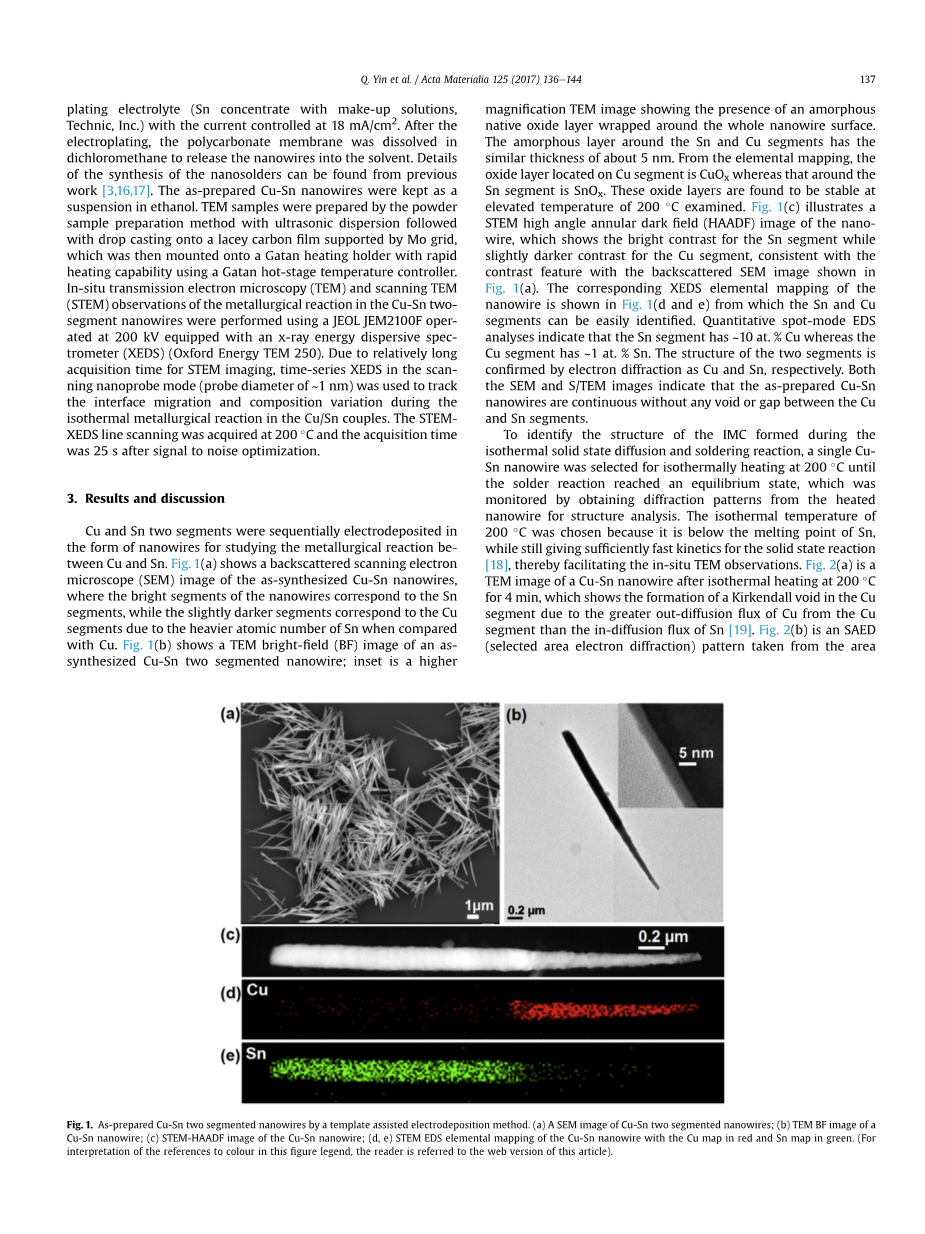 铜锡两段纳米线是在聚碳酸酯多孔膜模板(滤纸)的辅助下,通过室温连续电沉积制作而得。铜沉积第一次使用商业镀铜电解液,电流控制在2毫安/平方厘米。镀铜后,锡层被电镀使用商业镀锡电解液,电流控制在18毫安/平方厘米。电镀后,聚碳酸酯膜溶解在二氯甲烷中,从而产生纳米线到溶剂内。从以前的研究中可以找到纳米焊料合成的详细资料[3],[16]和[17]。所制备的铜锡纳米线作为悬浮液被保存在乙醇中。按照超声分散后投射到由钼栅极支持的莱西碳膜上的粉末样品的制备方法制TEM样品,然后安装到使用加坦热台温度控制器的具有快速加热能力的加坦加热架上。原位透射电子显微镜(TEM)和扫描显微镜(STEM) 对铜锡两段纳米线冶金反应进行的观测使用了配备x射线能量色散谱仪(XEDS)的在200KV下运行的JEOL JEM2100F (牛津能源TEM 250)。由于扫描透射式电子显微镜(STEM)成像采集时间相对较长, 在扫描探针模式(探针直径小于1纳米)时序XEDS被用来跟踪铜/锡耦合等温冶金反应中界面迁移和成分变化。在200°C和信号噪声优化后采集时间为25 s的条件下获得了STEM-XEDS扫描线。
