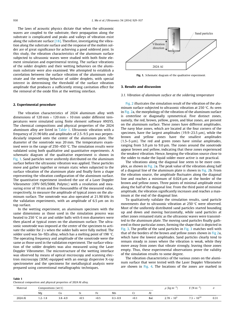 2024铝合金的振动特性,尺寸为120 mm *120 mm*10mm在不同温度下使用有限元软件ANSYS模拟。 2024铝合金的化学组成和物理性质列于表1中。将频率为21.90kHz和振幅为2.5-9.5mu;m的超声波振动垂直施加到铝板的中心。超声波发生器的直径为20mm。所检测的温度在250-450℃的范围内。模拟结果使用定性和定量实验验证。定性实验的示意图如图1所示。在施加超声波振动之前,砂粒子均匀地分布在铝表面上。当受到铝板的表面振动时,这些颗粒移动并聚集在一起或保持静止,并且最终形成表示铝表面的振动配置的形状。定量实验涉及使用分辨率和测量误差分别为10nm和测量值的千分之五的激光多普勒测振仪(OFV-505/5000,Polytec),以测量铝表面上典型区域的振幅。超声波发生器在验证实验中也在21.90kHz下操作,其顶部表面的振幅为6.5lm。