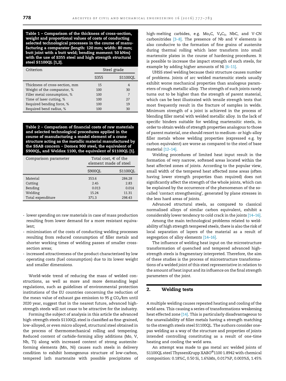 表1 -横截面厚度的比较,成本和传导成本的比例值制造过程中所选择的工艺流程(长度:120毫米;宽度:80毫米);对接对接焊接接头;弯矩:50 kNm)用S355钢和高强度结构钢s1100ql [1,2] |