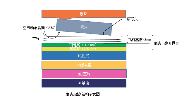 机械硬盘(Hard Disk Drives,简称HDDs)结构如图1.1所示,主要由磁头、磁盘、主轴等几个部分组成,各组成元件都设计存储在一个密封的腔体中。当机械硬盘工作时,磁盘盘面高速旋转,使得磁头不与盘面发生接触,磁头在悬臂的作用下与盘面保持一定的距离,这个距离称为“飞行高度”(Flying Height,简称FH),这种状态称为“飞行状态”。在这种状态下,磁头既不会与盘面发生磨损,又可以达到读取数据的目的[2]。