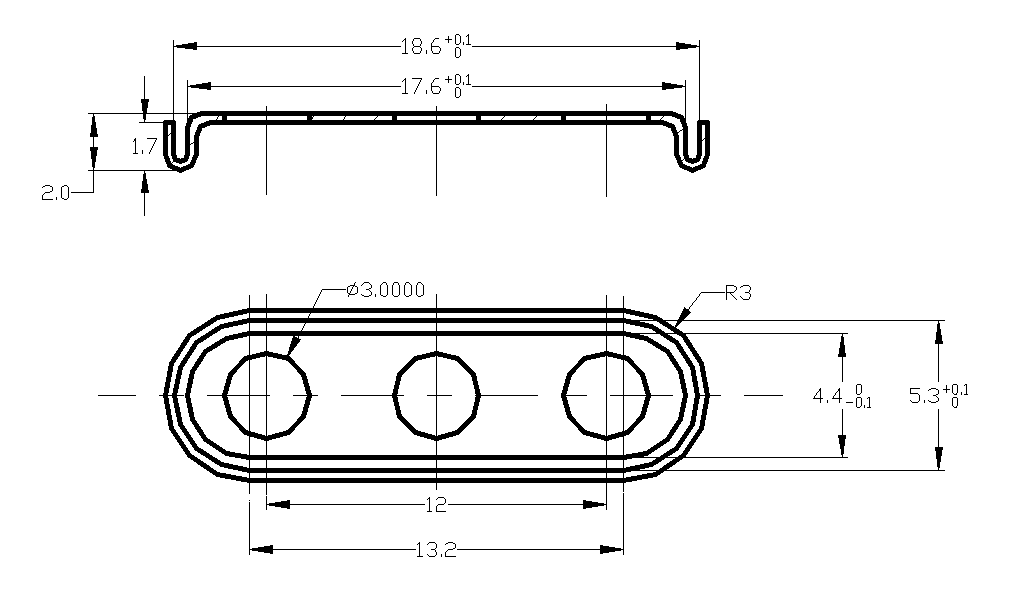 本课题所要设计模具的零件为一外壳的基座,零件图如图2.1所示。零件所用材料为Ni29Co18可伐合金,料厚为0.3mm,要求大批量生产。该零件最小孔径为Phi;3mm,最小孔边距为3mm,满足冲裁工艺要求,且零件所用材料可伐合金的冲压性能好,适合冲压加工。零件外形为一长圆形筒形件,尺寸小,左右对称,顶部有三个等大的圆形孔,底部有翻边。生产该零件的主要工序有冲孔、翻边、拉深、落料等。
