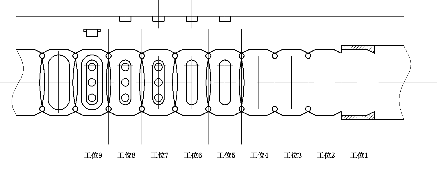 在进行排样设计之前,首先应该确定出一共有几个工位,根据零件图可以看出,要加工出这个零件需要的工序有拉深、冲孔、落料、翻边。一共四道工序,但并不是只要四个工位就能完成零件的加工,因为并不知道拉深和翻边是不是都能一次完成,故需要进行验算。本零件是一长圆形筒形件,可按圆形筒形件来计算拉深工艺,经计算,拉深只需一次就可成型。但为了防止拉深过程中零件被拉裂和提高材料的拉深性能,将拉深分为两步完成,即第一步采用较大的圆角半径,第二步才是零件的圆角半径,并在拉深工序前设计冲切口工艺孔和冲切口工序。翻边变形的原理和拉深变形的原理一样,有一个最小弯曲半径,即存在一最大变形量,如果翻边变形量大于最大变形量,毛坯就会被弯裂,为了防止这种现象的发生,应采用多次翻边的方式进行加工。经计算,只需一次翻边就可完成加工。因此,该零件的加工一共需要九个工位。