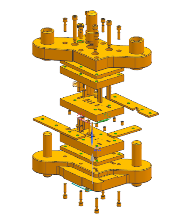 (3)现在的许多零件都要求大批量生产并且要求有较高的生产效率,为了满足这些要求,将模具上的送料机构和出料机构都设计成了自动化的设备。在有一些生产条件下要求在一套模具上加工出几种不同的零件,因此设计出了能够快速更换模具的设备。虽然冲压加工的自动化程度很高,但还未能实现全自动生产,近几年来,科学技术人员也开始进行全自动冲压加工中心的研究,将冲压加工的全过程都集中在一起以节约时间。