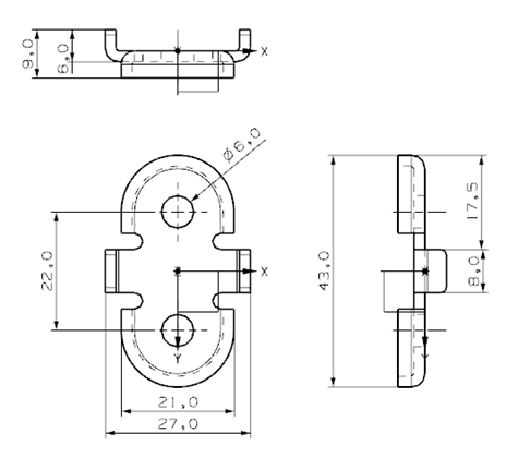 该零件是一个钣金件,有对称的外圆翻边和弯曲并且有两个直径为6mm的孔,零件较薄,在我们这里采用级进模成形。该零件展开后外轮廓较为复杂,要求的尺寸精度偏高[2]。一般冲裁件的经济公差等级不能高于IT11,落料的公差等级最好要低于IT10,冲孔的公差等级最好要低于IT9,因此可由参考文献[1]表4-1查得该制件的落料公差和冲孔公差,由参考文献[1]表4-2查得孔的中心距公差,并且由于冲孔的精度要求较高,因此可用高精度的冲孔公差等级,由于冲裁件没有断面粗糙度的要求,所以我们不必考虑冲压断面的粗糙度要求,但要保证制件边缘能出现较大的飞边和毛刺。[1]