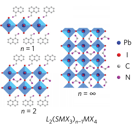 二十一世纪人类面临着能源与环境问题的严峻挑战,因此能源的清洁开发和高效利用对未来人类社会的低碳经济与可持续发展具有重大意义。发光显示技术的发展进步是实现可持续发展的关键技术领域之一,其面对的核心问题是寻找和发展高效、稳定、低成本与环境友好的发光材料与器件。近几年,有机-无机杂化金属卤化物钙钛矿材料在光电器件的应用方面发展迅速,引起了国内外研究人员的广泛兴趣[1-8]。如图1-1所示,三维钙钛矿材料晶体结构为ABX3型,其中A位一般由甲脒离子(FA )或甲胺离子(MA )[9]等有机阳离子占据;B位一般是二价金属阳离子如Pb2 、Sn2 等;X位是卤素阴离子如Cl-、Br-、I-。金属阳离子与卤素阴离子在空间上形成八面体构成无机框架,有机分子通过氢键和库伦作用与无机框架连接,形成有机组分和无机组分交替堆积的长程有序结构。较低维度的钙钛矿,例如二维钙钛矿可以认为在ABX3结构基础上沿着特定的晶格方向拆分之后,再将大尺寸的有机阳离子沿着表面的法线方向垂直组装而形成(如图1-2所示)。钙钛矿层数n = 1时为二维结构,当n上升为∞时转化为三维结构,并且带隙会随着维度的增加而减小[10]。