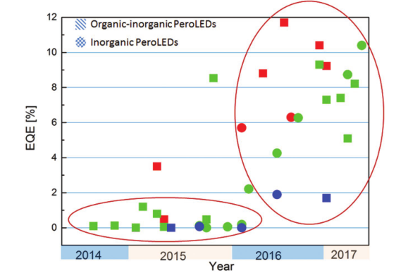 Organic-inorganic hybrid perovskite materials have drawn significant interest in the past few years. This material can be prepared by solution processing at a low temperature to obtain a direct band gap semiconductor film. Besides, this material has superior optoelectronic properties, such as high carrier mobility, high color purity, precise and facile tunable luminous wavelength from visible to near-infrared spectrum, and high photoluminescence quantum yield. These properties render perovskites suitable for next-generation high-definition display and lighting systems. However, the stability of the perovskite LEDs are very limited. Its poor photostability, thermal stability, and ambient stability limit their practical application, which has also attracted much attention of many scientists and researchers.