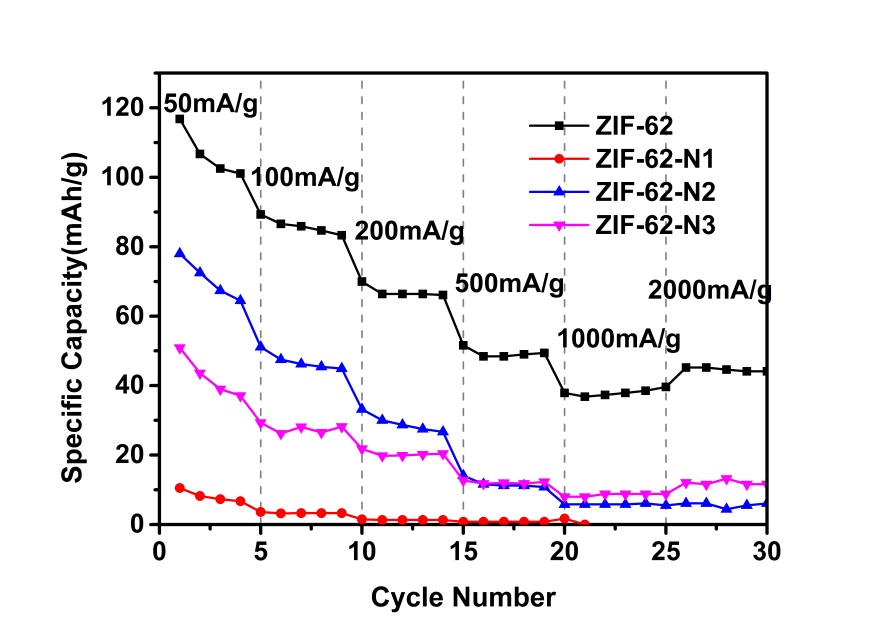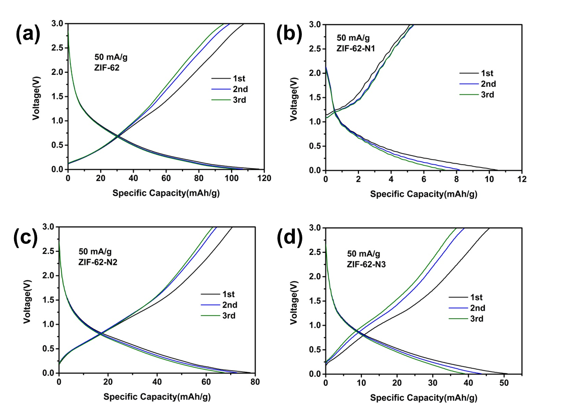 本次实验采用溶剂热的方法制备了ZIF-62以及掺杂氮元素的复合ZIF-62,采用了X射线衍射(XRD)、扫描电镜(SEM)等测试方法对所制备的负极材料进行物理性能表征。利用恒流充放电,循环伏安(CV)和电化学阻抗谱(EIS)等测试手段对组装的锂电池进行了电化学性能研究。恒流充放电测试结果显示:ZIF-62、ZIF-62-N1、ZIF-62-N2和ZIF-62-N3的初始放电比容量分别为116.8 mAh/g,10.6 mAh/g, 77.8 mAh/g 和48.7 mAh/g。表明ZIF-62作为锂电池负极储锂的位置不在氮位点上。