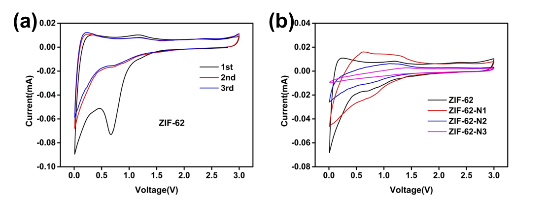 Recently, some researchers reported the excellent electrochemical performances of ZIFs used as cathode for lithium ion batteries, and confirmed that lithium ions are storage in the nitrogen functional groups of ZIF materials. Now, there are few studies focus on the lithium storage mechanism of ZIF materials as anode for lithium ion batteries. For this reason, this paper choose ZIF-62 and nitrogen ZIF-62 anode materials as research objects to explore whether lithium ions are stored at nitrogen sites on ZIF-62 or not.