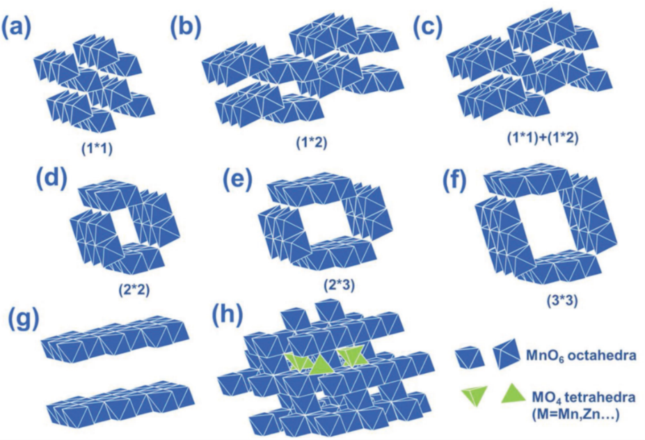 (a)β-MnO2 (软锰矿型)(b)R-MnO2(斜方锰矿)(c)γ-MnO2(六方钾矿)(d)α-MnO2(锰钡矿)(e)钡硬锰矿(f)钡镁锰矿(g)δ-MnO2 (水钠锰矿) (h)λ-MnO2 (尖晶石结构)