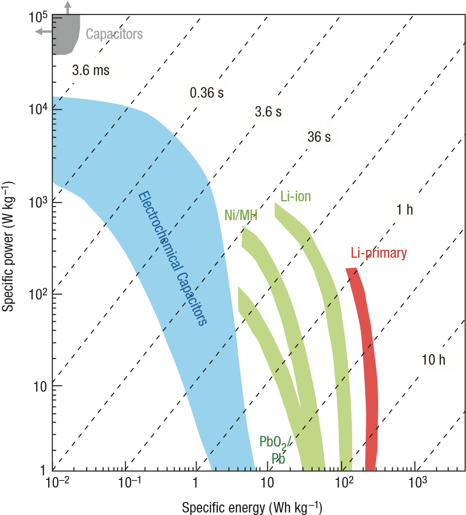 图1.1 各种电能存储设备的比功率与比能量的关系(Ragone图)[1]