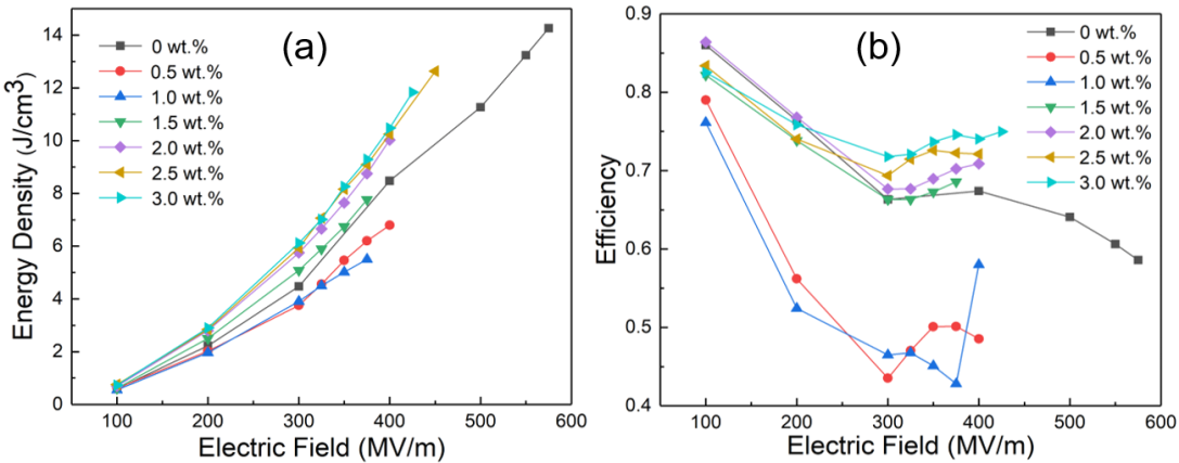Therefore, BN is used as filler and PVDF is used as organic ferroelectric polymer. The effects of BN two-dimensional filler content on the dielectric response, breakdown strength and energy storage density of the composite material are mainly studied, and its structure and properties are characterized by modern testing methods. The main research results are as follows: Two BN/PVDF composite films with different BN materials were prepared by tape casting; under the same field strength, the composite film has the highest energy storage density and efficiency at 3.0 wt.% of BN modified by PEI, which is 11.83 J/cm3 at 425 MV/m, and the highest energy is at 2.0 wt.%, which can reach 12.64 J/cm3 at 450 MV/m; When the content of unmodified BN is 2.0 wt.%, the energy storage density and efficiency reach the maximum, reaching 9.98 J/cm3 at 400 MV/m.