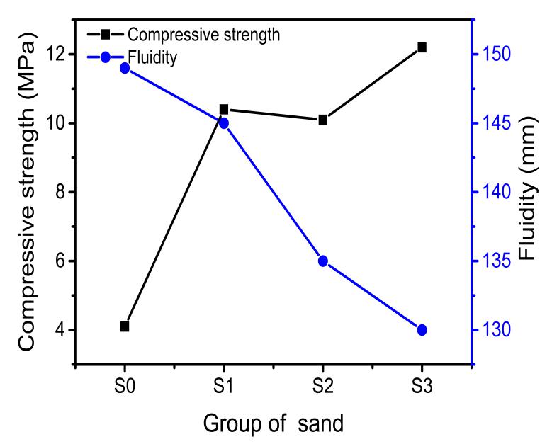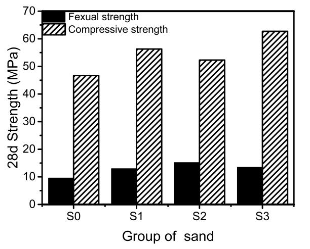 (1)采用二级配方法配制的粒径在1.18mm以下的机制砂,相比同粒径范围的的天然级配砂制备的自流平砂浆,砂浆流动度降低的并不显著,但用机制砂制备出来的机制砂自流平干混砂浆强度普遍高于天然河砂自流平干混砂浆;