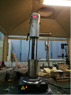 将适量的沥青原料置于135±5C的烘箱中加热后,取出300g左右倒入剪切桶中,置入剪切头至被沥青浸没。以4kr/min-5kr/min的剪切速率预剪切30min,同时保持温度稳定在160±5C。然后再添加复配改性剂,由于不同改性剂的老化特性不同,因此对剪切速率及时间有不同的要求,两种添加剂的熔融共混方法在表2.3中列出。熔融共混工艺实物图见图2.1。