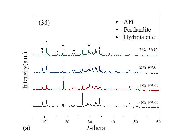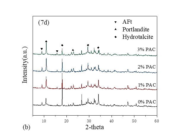 国外Taewan Kim[17]等人研究了聚合氯化铝对碱矿渣水泥浆体力学性能和微观结构的影响,通过将聚合铝以不同掺量添加到混凝土中,养护1、3、7和28天后,分别测其水合产物的XRD图谱、MIP分析、抗压强度、热分析以及SEM图像,得出结论:PAC中含有的氯离子促进了矿渣水泥中Friedel盐的形成,铝离子促进了C-A-S-H凝胶的形成。随着PAC掺量的增加,这种结构变化也随之增加;PAC替换一部分混合水可在1-28天的整个时间内提高矿渣水泥的强度;在较高的PAC掺量下,强度增加最为显着;PAC含量促进了细磨粒化高炉矿渣的水化,导致水化产物中更高的Ca / Si和Al / Si比,进一步促进了添加到矿渣水泥中的碱活化剂对矿渣的水合作用。