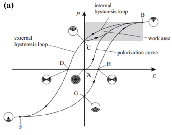 PZT晶胞中原子的排列方式为中心对称时,此时PZT无压电性,是立方对称钙钛矿结构。而PZT晶胞中的Zr4 和Ti4 会非常容易偏离原本的八面体中心,产生电偶极矩,这就引发了自发极化现象。对于单个晶胞其极化方向是确定的,形成一个偶极矩。而对于不同晶胞其偶极矩会发生相互作用产生一个极化方向相同的区域,称为电畴。在未施加电场时,PZT内部电畴方向任意,材料整体对外不表现出电性。而当施加一定外电场后,PZT内部极化方向不同的电畴会朝着外电场的方向运动。当去掉外电场后部分电畴会恢复到原本的状态,而另一部分电畴受材料内部应力的影响无法恢复,这一部分电畴的极化强度就是剩余极化强度。如图1.2中C点。这时施加反向电场,当电场增加到一定值时,晶粒恢复到初始状态,这个电场强度就是矫顽场强度。如图1.2中D点。像这样在电场的作用下,通过使电畴运动来使PZT产生形变,称为逆压电效应。再随着反向电场增大,PZT会达到反向饱和状态。如图1.2中F点。而随着反向电压减小并再次反向增大,极化强度会再次减小到0之后继续增加到饱和。[1,2]