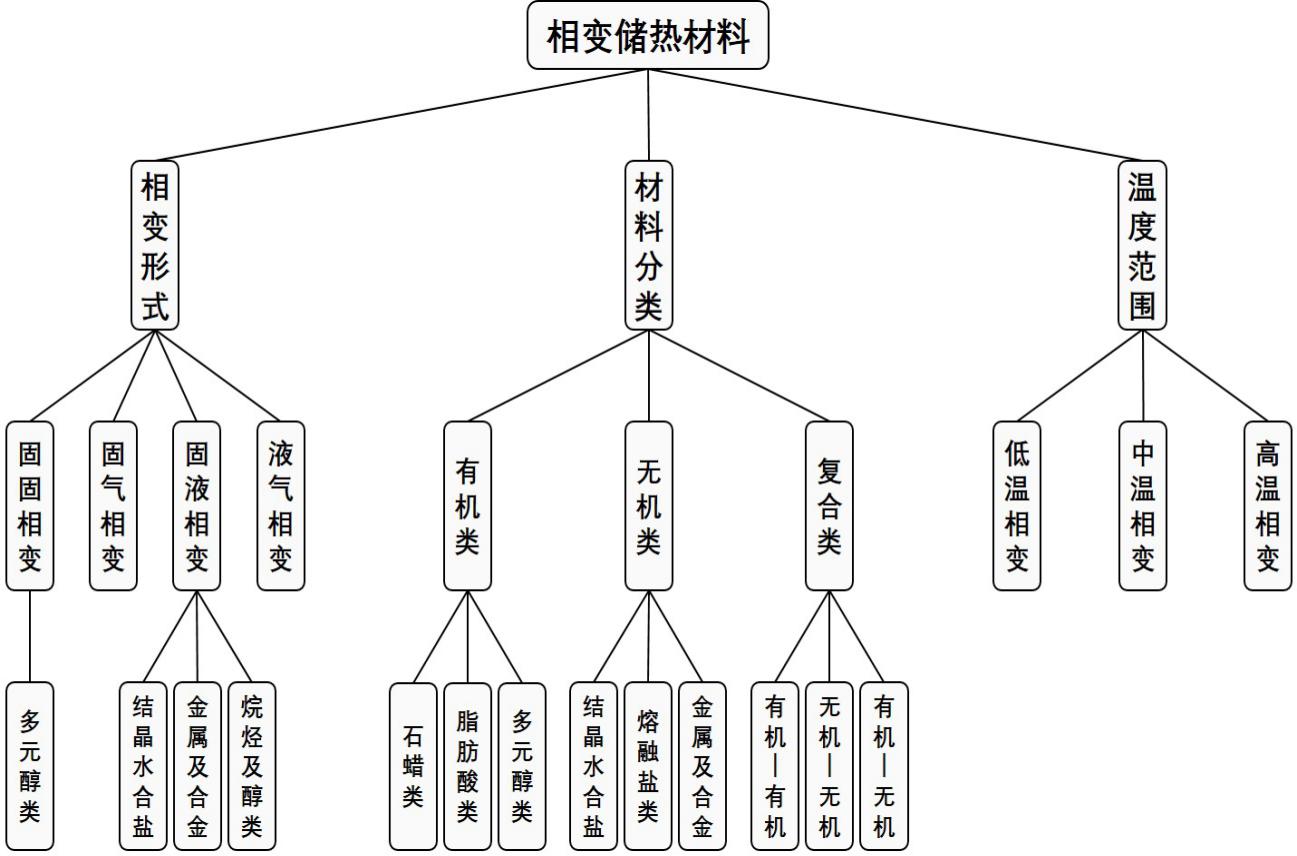 潜热式储热材料通常由多种组分构成,主要包括:主储热剂、成核剂、相变点调整剂、防相分离剂、防过冷剂等[4];根据不同基准可以分成不同的类别,大致如图1所示。