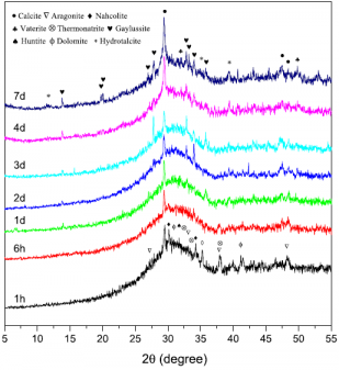 本文主要研究了利用镁离子掺杂改性低碳胶凝材料力学性能的方法,以镁离子为稳定剂,调控碳酸盐激发低碳胶凝材料中早期生成的无定形碳酸钙物相重构过程,研究无定形碳酸钙(ACC)在碳酸盐激发矿渣水泥胶凝材料中的重要作用。采用等温量热法、红外光谱、X射线衍射、热重-差热分析、扫描电镜等研究了NaCO3激发矿渣的反应过程和反应产物。通过以上试验发现C-(A)-S-H凝胶在制样后约2d开始凝胶化,钠钙石的积累和水滑石的形成对降低CO32-阴离子有重要作用,进而导致C-(A)-S-H凝胶的形成,得到了不同龄期初始碱浓度与抗压强度的线性关系。