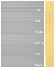 - 通过优化工艺参数,在重复频率100KHz,刻写速率50μm/s,单脉冲能量0.2μJ时,成功刻写出直径为7.6μm、插入损耗为2.3dB的传输性能良好的Ⅰ类光波导;