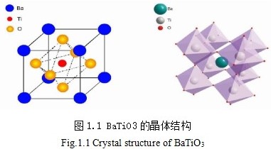钛酸钡是一种拥有钙钛矿结构的物质,在一般情况下钛酸钡的晶体结构是立方晶系,如图1.1所示。在钛酸钡的晶体结构中钡离子与氧离子共同组成了面心立方堆积,钡离子、氧离子分别位于晶体结构中的顶角和面心,钛离子位于体心。钡离子、氧离子、钛离子-的配位数分别为12、6和6。钛离子占据八面体空隙的1/4。[TiO6]八面体共顶连接形成三维结构。