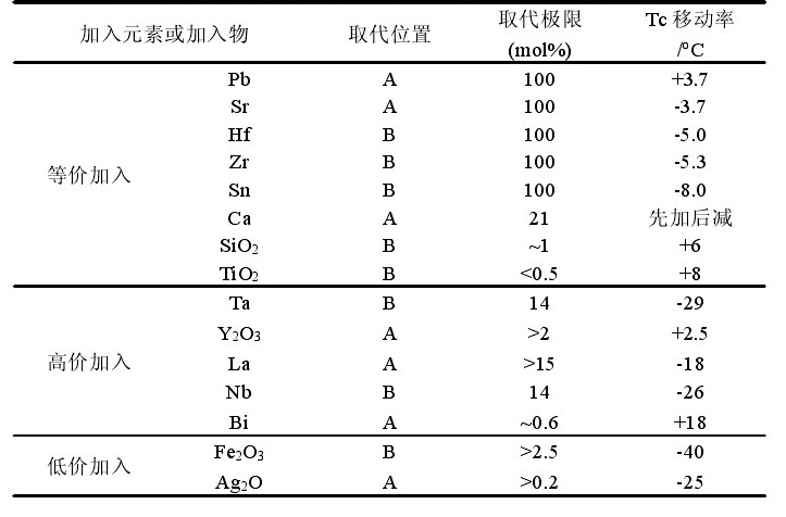 常见的作为MLCC的介质材料体系由钛酸钡体系、铅基钙钛矿体系、钨青铜结构体系。钛酸钡具有高介电常数、价格便宜等优点,因此较早被应用于多层陶瓷电容器的制备。但是,钛酸钡在居里点介电常数会发生突变,介电峰变得异常尖锐,温度超过130℃后,介电常数又会急剧下降,这些缺点使得钛酸钡不能直接被用作多层陶瓷电容器的制备。因此,人们不断地探索钛酸钡的改性方法,以此提高钛酸钡基陶瓷的温度稳定性。