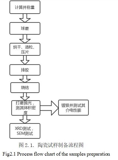 本文采用固相法来制备掺杂不同氧化物的原料粉体,经压制成型后排胶,在不同温度下烧结,测量陶瓷体积密度,得到体积密度最大的样品,即为烧结最致密的样品。对烧结好的样品进行X射线衍射分析(XRD)和扫描电子显微分析(SEM)测试,并对其介电性能进行测试。