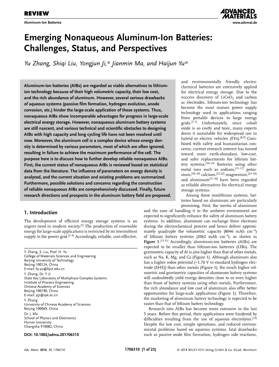 新兴的非水性铝离子电池:挑战、现状和前景外文翻译资料