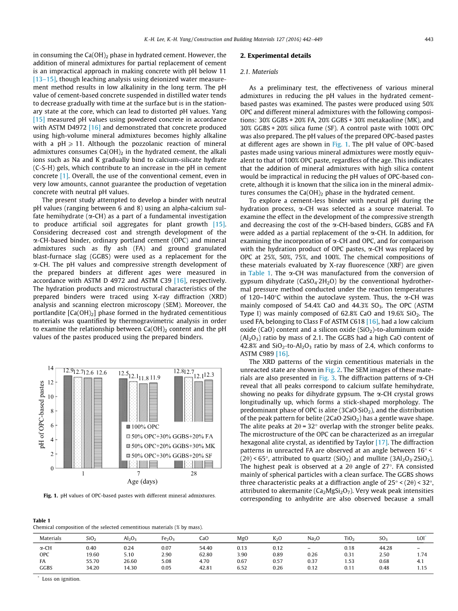 降低植被混凝土pH值的最大努力集中在使用矿物混合物的多孔混凝土[8-10]。关于水泥混凝土pH的文献综述[11,12]指出,具有高二氧化硅含量的矿物混合物在水合水泥中消耗Ca(OH)2相是有效的。然而,添加矿物混合物部分替代水泥是一种不可行的方法,在制备pH低于11 [13-15]的混凝土,虽然使用去离子水测量方法的浸出分析导致长期低碱度。悬浮在蒸馏水中的水泥基混凝土的pH值在表面处趋于随时间逐渐降低,但在芯处处于静止状态,这可导致pH值变形。杨[15]根据ASTM D4972 [16]使用粉末混凝土测量pH值,并证明使用大体积矿物混合物生产的混凝土变得高度碱性,pH值为11.虽然矿物混合物的火山灰反应消耗了Ca(OH)2在水合水泥中,碱离子如Na和K逐渐结合到硅酸钙水合物(CSH)凝胶,这有助于增加水泥混凝土的pH值[1]。总的来说,即使以非常低的量使用常规水泥,也不能保证具有中性pH值的植被混凝土的生产。