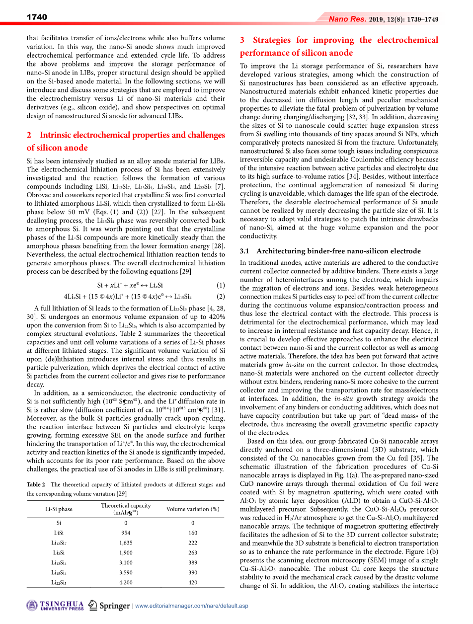硅的完全锂化导致Li22Si5相的形成[4,28,30]。在从Si到Li22Si5的转换过程中,Si经历了高达420%的巨大体积膨胀,这也伴随着复杂的结构演变。表2总结了一系列Li-Si相在不同锂化阶段的理论容量和相应的体积变化。硅在脱锂化时的显著体积变化引入了内应力,导致颗粒粉碎,从而使活性硅颗粒在集流体中失去电接触,并导致性能衰减。