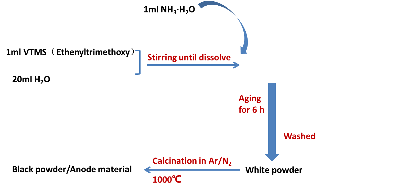 Nowadays graphite is the most commonly used commercial lithium ion batteries anode material. However graphite with a low theoretical capacity of 372 mAh g-1 greatly restrict its improvement so long as our society develops currently. So it’s highly urgent to explore new anode material with high theoretical capacities to replace graphite in the next-generation high energy lithium ion battery. In preparation in the commercialized SiO, it’s mainly through a complex, energy-consuming, high cost process in which the gas phase silicon dioxide and Si are mixed according to the calculated the stoichiometric ratio in vacuum conditions at high temperature. Si/O ratio is also difficult to control the whole process is not environmental friendly. So it’s urgent and meaningful to bring up a new method which is both low-cost and simple for the direct synthesis of SiOx.