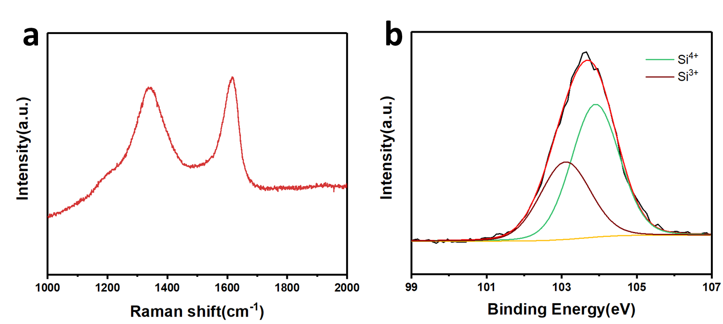 - 用stober法合成有机硅小球作为前驱体,经一步热解得到粒径400nm均一的SiOx-C小球,x值用XPS测试推测大约为1.81,拉曼结果显示D峰与G峰的比例较小,TEM图中可观察到明显的石墨晶格条纹,证明1000℃惰性气体烧结已经可以使碳有较高的石墨化程度,材料中的碳不仅可缓冲体积膨胀还可以提供良好的导电性;其电化学反应阻抗很小只有20.23Ω,SiOx-C小球负极材料有极高的首次库伦效率(74%),较高的可逆比容量,优异的循环性能和倍率性能,100mA g-1的电流密度下可逆比容量约为1000mAh g-1,在1A g-1的电流密度下,在循环300圈后依然有686.2mAh g-1的可逆容量,容量保持率高达97%。此材料合成成本低廉,工艺简单,环境友好,且有进行工业化生产的潜力。