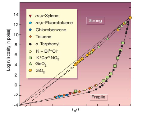 Angell图将不同成份的玻璃熔体的动力学特性放在同一个坐标轴上进行比较,横坐标采用玻璃转变温度对温度的比值的约化温度,以此可以研究粘温特性的变化以及玻璃转变。定义粘度随温度变化的方程显示为一条直线时为强玻璃,曲线偏离直线方向越远就表示玻璃越弱即脆性越大对应玻璃的形成能力越小。