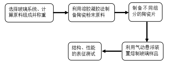本实验主要根据不同组成的CaO-Al2O3二元体系玻璃在Tm附近的高温区和Tg附近的低温区的动力学特性,来探究其玻璃形成过程中是否存在强弱转变现象并根据相关测试表征手段来探索强弱转变的微观机制,根据研究目的及现有制备及测试表征手段,设计如下实验流程: