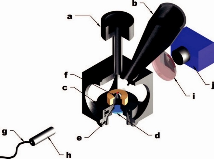 本实验选用气动悬浮技术来合成CaO-Al2O3二元体系玻璃及完成对样品在高温区域(熔点Tm附近)热物理性能的原位测量。空气动力悬浮装置处理室的结构如图2.2所示。